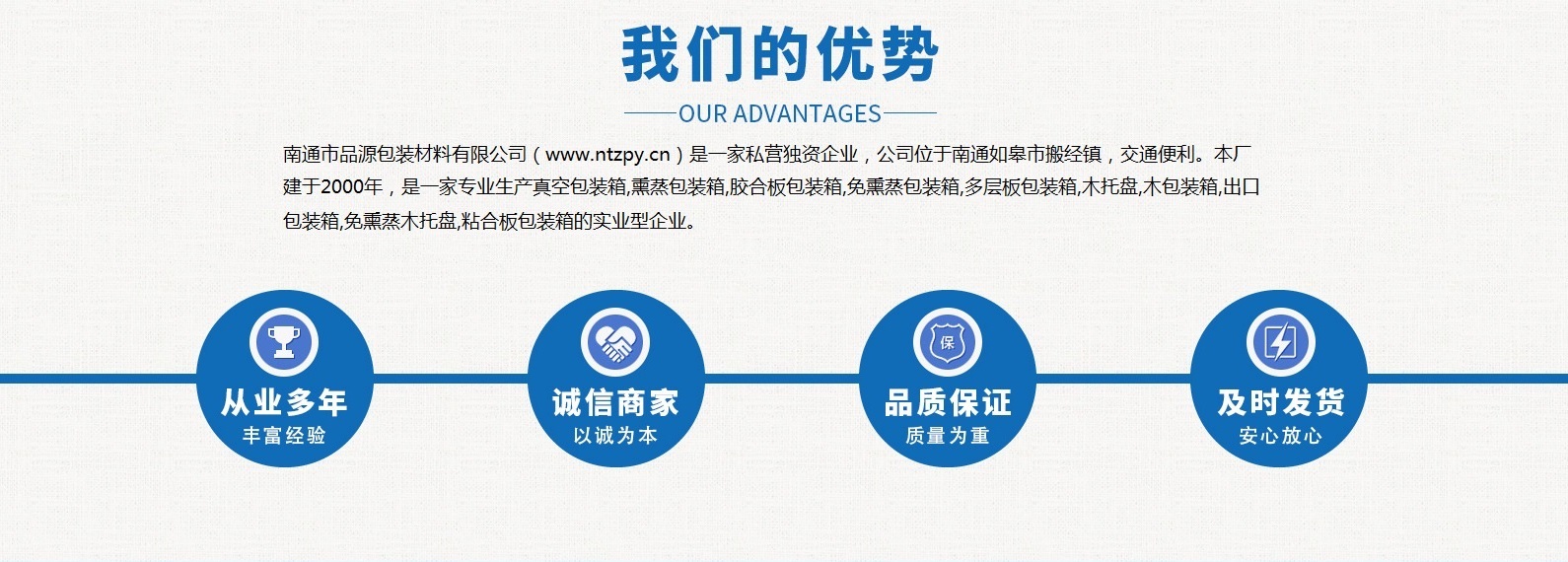 南通市品源包裝材料有限公司(www.sdtbsw.com)是一家私營(yíng)獨(dú)資企業(yè),公司位于南通如皋市搬經(jīng)鎮(zhèn),交通便利。本廠(chǎng)建于2000年,是一家專(zhuān)業(yè)生產(chǎn)真空包裝箱,熏蒸包裝箱,膠合板包裝箱,免熏蒸包裝箱,多層板包裝箱,木托盤(pán),木包裝箱,出口包裝箱,免熏蒸木托盤(pán),粘合板包裝箱的實(shí)業(yè)型企業(yè)。